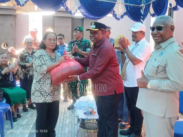 Gubernur Papua Barat, Drs Dominggus Mandacan MSi, menyalurkan bantuan untuk warga terdampak banjir di kawasan Wosi, Manokwari, Jumat 17 April 2026.